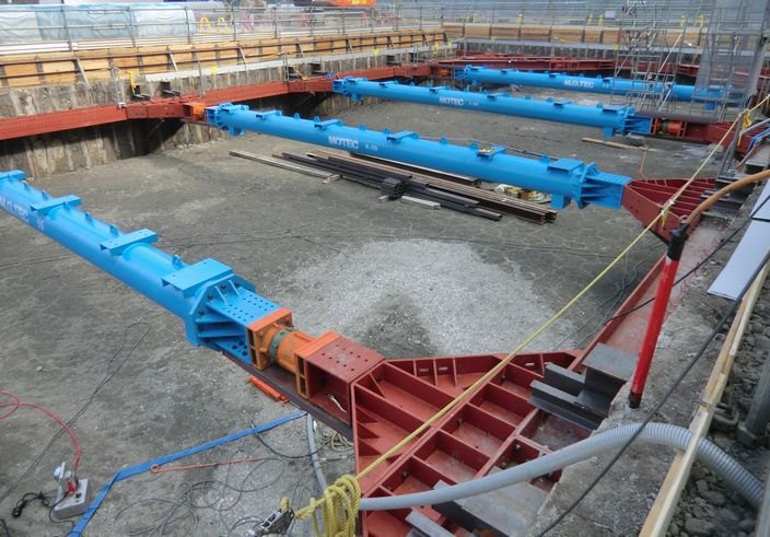 円形鋼管切梁「Circular Strut」は、断面性能が一定の円形鋼管を用いた切梁で、従来は一般的なH形鋼の切梁で対応していた。本技術の活用により、ロングスパンでも中間(棚)杭を削減でき、土工等の作業効率が上がり、鋼材費用や施工手間等が低減できるため、施工性および経済性の向上が図れる。