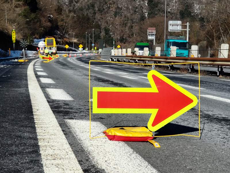 「強風アロー」は交通誘導が必要な場所に設置する矢印板で、従来は山型矢印板を使用していた。強風アローの活用により、耐風性能が向上し、風による矢印板の移動や飛散の危険性が低下し、安全性が向上する。