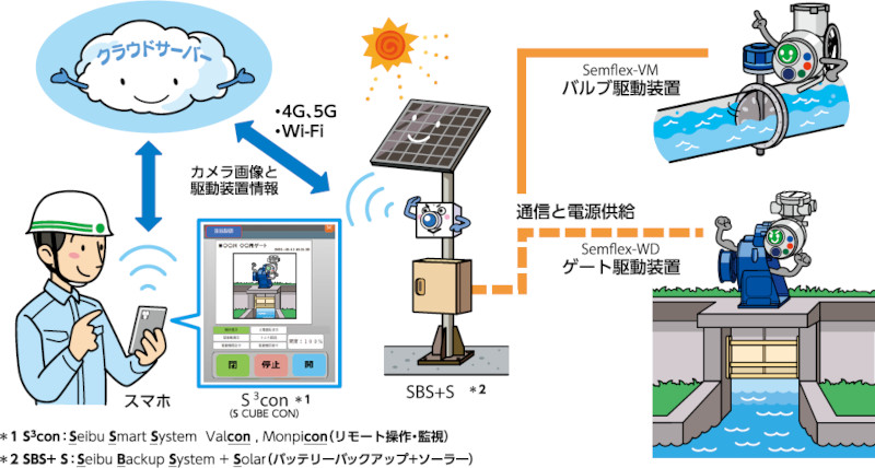 昨今のゲリラ豪雨などの自然災害への対策を備えておくことは重要である。また、オペレーターの高齢化のほか、増水する河川付近での操作など、災害時の手動式ゲート駆動装置の操作は危険が伴う。西部電機ではこれらの手動式ゲート駆動装置の簡易電動化を可能とする製品をラインナップしている。またリモート操作・監視システム「S 3CON」を併用するとにより、災害時に危険な現地に行くことなくタブレットなどの携帯端末にて現地状況の画像確認およびゲートの開閉操作をすることができる。さらにこの電動ゲート駆動装置の動力源として、ソーラーパネルと蓄電池を搭載したバッテリーバックアップシステム+ソーラー「SBS+S」を設置することで、電源確保が困難な場所においても電動操作が可能になる。またリモート操作・監視システム「S 3CON」を併用することにより、現地に行くことなくタブレットなどの携帯端末にて現地状況の確認および操作をすることができる。