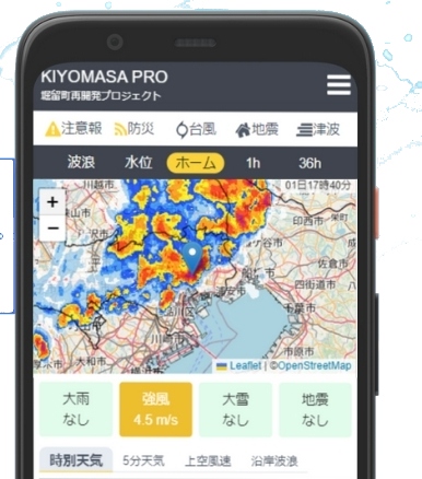 「KIYOMASA PRO」は、建設現場専用のピンポイント気象予測サイトとアラートメール通知がついたサービス。現場に特化した気象予測や作業可否判断の手助けとなる通知を生かし、荒天による労働災害リスク、機材損失リスク、工程管理・品質管理リスクといった、あらゆるリスクを事前に知らせ、回避できるよう支援するツールである。デジタルサイネージなどの大型モニターと連携したり、ピンポイントではなく上流域や広範囲の施工範囲などを面的に監視しアラート通知するオプション(※有料)も付けることができる。