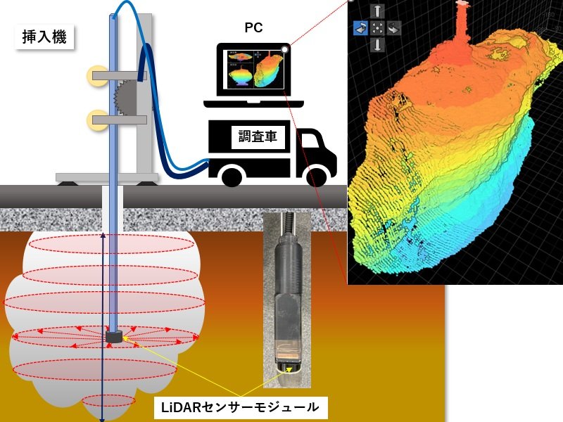 小口径(φ6cm以上)ボーリングの削孔口より小型LiDAR(レーザー光を利用した測距センサー)を挿入し、道路下、構造物背面等の空洞の3次元形状を計測する装置。本技術では360度測定可能な2次元LiDAR(Light Detection And Ranging)センサーを使用。挿入機で上下させながら測定する事により、空洞の3次元形状を点群データ(XYZ座標値)で取得、測定可能である。また必要最低限の削孔口からの空洞の点群データ取得をし、座標位置からそれらを結合することにより、空洞全体の形状を把握することが可能であり、結果的に体積計算をも可能とする。