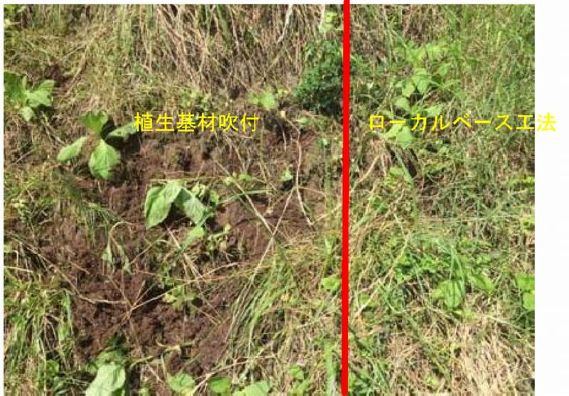 ローカルベース工法の主な特長は、1)保水性の高い基盤材。2)環境にやさしい接合剤、パルプ工場の排材活用。3)コストダウン。