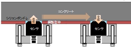 パルストメーターは、脱型強度の発現を、超音波方式により推定する技術である。コンクリート圧縮強度と、超音波の最大振幅波形には非常に高い相関関係が示されることから、覆工コンクリートの圧縮強度をリアルタイムに捉えることができ、センサをセントル天端に取り付けることで、打設の最終点で発現強度推定が可能である。