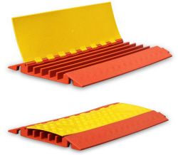 仮設の工事現場や工場内に引き込む各種ケーブルや電線、ホースを車両や歩行者から保護する、耐久性に優れた強化型ケープルプロテクター。 従来は施工現場でコンパネを細工したり、溝を掘って敷鉄板を被せるなどしていたが、本製品に収容するだけで手軽にケーブルを保護でき、工事が不要になる。