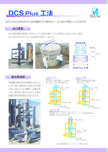 「DCS Plus工法」は、枠型相対攪拌翼で改良土を外側に押し出すことなく撹拌し、余剰土を上方へ速やかに排土可能な地盤改良工法である。従来は深層混合処理工で行っていた。DCS Plus工法の活用により改良体内部の側圧が減少することで周辺地盤の変位を低減でき周辺環境への影響抑制が図られる。