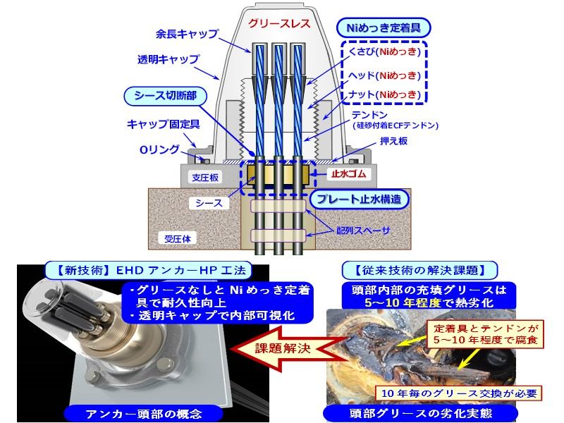 PC鋼より線の各素線間までエポキシ樹脂を充填した耐久性の高い引張り材、付着型ECFストランド(FLO-BOND)を使用し、簡素な構造でありながら水密性を高めて高耐久性を実現。またアンカー頭部には確認窓を有した部材を使用することで、防錆材の充填状況および劣化状況の目視管理が可能。