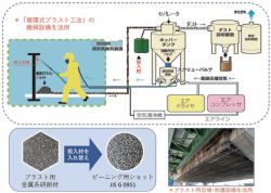 「ECO-SCOP工法」は、分析用途の塗膜採取のための仮設備足場や塗膜飛散を防止する飛散防護工等は必要なく、塗装面作業箇所に接近し安全確実に塗膜(分析試料)の採取と回収を可能とする作業工法である。塗装面積部位や複雑な条件の構造でも、周辺環境汚染や作業員の吸引による健康被害の防止が期待できる。