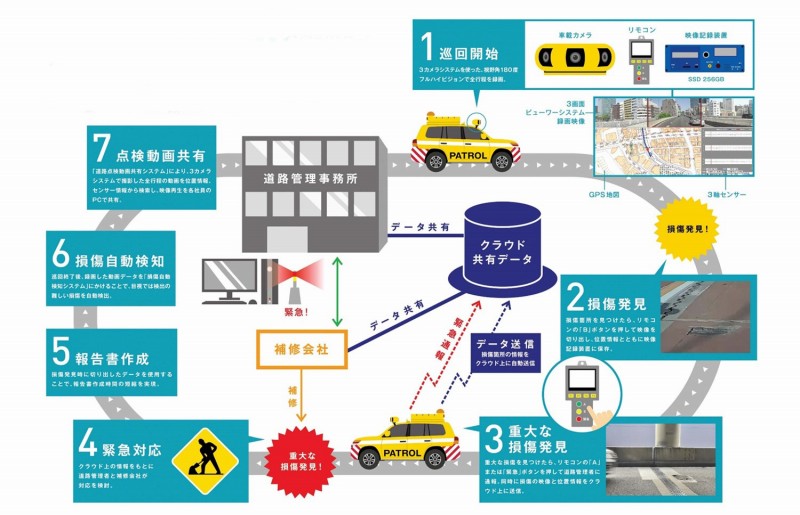 インフラパトロールは、位置、時刻等を有する映像を取得し、リアルタイムストリーミング映像の配信や、保存した映像を活用するシステムであり、従来技術は車上などからデジタルカメラで静止画を撮影していた。本技術の活用により巡視業務を高度化、効率化することができる。