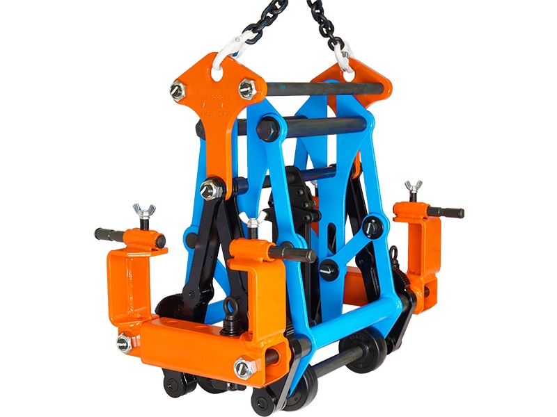 可変側溝用掛金具のハンガーピンと吊り幅調整機構を使い、1台のクランプで可変側溝とU字溝の両方、および内幅の異なるブロックの吊り上げが可能。従来は可変側溝用とU字溝用の吊りクランプをそれぞれ用意する必要があったが、1台で両方のブロックが吊り上げ可能なため、作業効率および経済性が向上する。自動着脱装置付きで、効率よく安全な作業ができる。本体のセンタ-位置に取り付けており、クレーン操作で吊り上げ、開放が可能。自動着脱によりクランプの取り付け・取り外しが迅速に行えるため作業時間が短縮され、手動の取り扱いが減ることで怪我や事故のリスクも低減される。