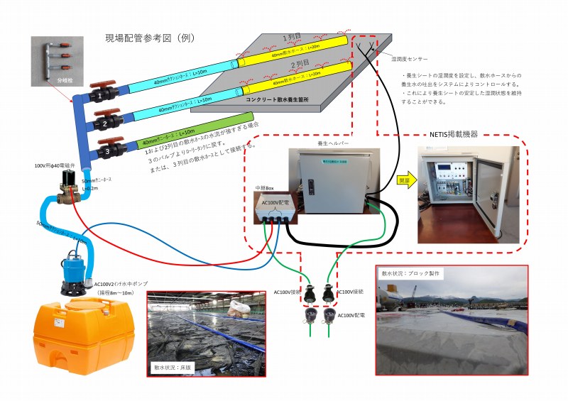 「養生ヘルパー」は、コンクリートの湿潤養生の養生水を自動で給水する技術で、従来は養生担当者が養生シートの湿潤・乾燥状態を目視確認し給水が必要かを判断してその都度給水していた。本技術の活用により給水判断と給水作業が自動になり省人化が図られ経済性の向上が期待できる。