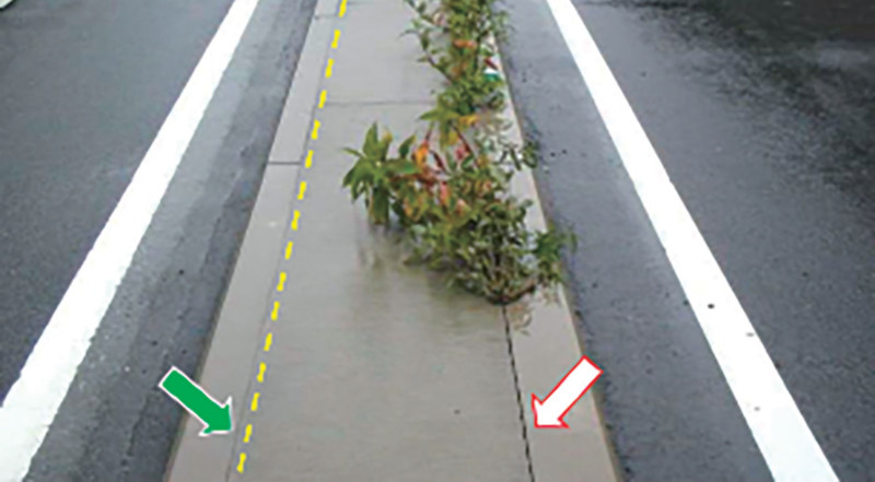 「雑草防止工法」は、歩車道境界ブロック、側溝、管渠型側溝等、コンクリート製品と舗装に隙間を発生させず、雑草を自然に枯らして成長を強力に防止する防草機能を有する技術である。