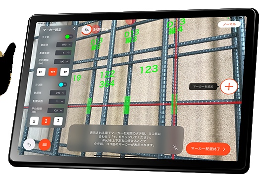 「BAIAS(バイアス)」は、iPad Proに搭載されたLiDARセンサーとカメラを活用し、鉄筋コンクリート構造物の配筋検査を1名で簡単に行えるシステム。計測時に通信不良やサーバーエラーによる再測の心配がなく、作業時間を約50~70%短縮する。国土交通省実施要領の全計測項目に対応。ARマーカー配置による「ノーマル」と点群取得による「クイック」、2種類の計測方法を実装し使い分けが可能。「ノーマル」は5m四方(ダブル配筋にも対応)、「クイック」は3m四方までの計測に対応。広範囲の計測も短時間で実施できる。鉄筋の本数や鉄筋間隔に加えて、鉄筋径、かぶり厚さ、重ね継ぎ手長・定着長の計測も可能。場所打ちコンクリート杭の施工に使用する円筒形状の鉄筋かごの計測も可能。また計測対象箇所の写真に計測結果をAR重畳表示し、工事写真として保存可能。設計図と計測結果を比較可能な帳票出力機能も実装している。