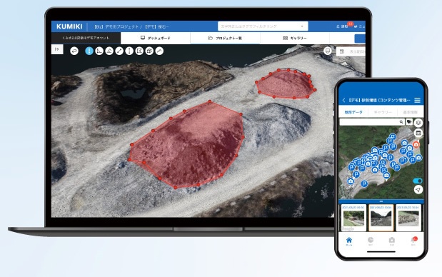 クラウド型ドローン測量サービス「くみき」は、専門知識なしで地形データを容易に生成可能なサービスである。ドローンで撮影したデータから、3次元点群データなどの地形データを自動生成し、測量業務や現地調査業務の効率を飛躍的に向上させる。本サービスは純国産であり、約30業種・5万件超の現場で活用されており、建設業、林業、農業などの一次産業や災害対応での利用が急速に拡大している。さらにその革新性が認められ、2023年11月には第7回JAPANコンストラクション国際賞 中堅・中小建設企業部門において国土交通大臣表彰を受賞している。