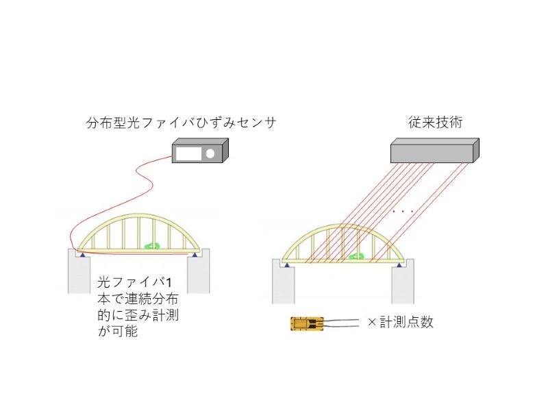 従来はひずみゲージによる計測で対応していたが、本技術の活用により、連続的なひずみ分布をリアルタイムに測定することが可能となるため、メンテナンスの質の向上が図れる。[概要]光ファイバー型ひずみ測定素子であるFBG(Fiber Bragg Grating)からの反射光を解析する測定器(※OFDR)を用いて、構造物のひずみ分布を取得できるモニタリング技術である。※OFDR(Optical Frequency Domain Refl ectometry:光周波数領域リフレクトメリ)[特長]光ファイバーに沿った連続的なひずみ分布情報から、橋桁・橋脚、トンネル内壁(覆工)等の変形をリアルタイムに検知できる。0.6mmのピッチで連続的かつ多点的にひずみ計測ができる。センサー部に電気・電子部品を使用していないため、防爆構造が必要な環境でも使用でき、落雷や電磁誘導の影響を受けずに計測することが可能である。