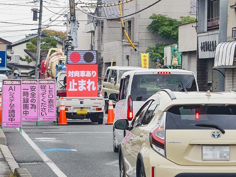 KB-eye for 交通制御は、片側交互通行の現場にシステムを設置するだけで、自動的に交通誘導警備を開始する。車両の通過数状況や周辺渋滞情報を自動的に取得することで、最適な信号切替タイミングを判断し、通行車両を滞留させることなく誘導することができる。既存の工事用信号による機械的な誘導ではなく、より人に近い判断で誘導を行うことができ、これまでは多くの警備員がいないと誘導できなかった片側交互通行の現場でも、配置人数を削減することができる次世代の交通誘導システムである。