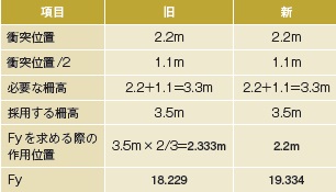 衝突位置h2が2.2mであるため,h2/2=1.1mを余裕高として設けると柵高はh2+余裕高=3.3mとなります。3.3mの防護柵は製品が無いため,3.5mの防護柵が採用されます。どちらも3.5mの防護柵が採用されますが,15°塑性ヒンジを形成するのに要する力Fyの値が異なってきます(表-6)。