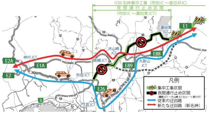 【図-9 名神集中工事の夜間通行止め時の迂回ルート】
