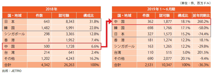 また,ベトナム政府は海外資本の受け入れを積極的に推進している(図表-9)。投資額の推移では,これまで日本と韓国の存在感が大きかったが,2019年に入り,中国からの投資が急増している(図表-10)。日本も含めて世界各国がベトナムに投資するメリットは,約1億人という人口を受け皿とした市場規模と今後の成長性,一党体制による安定した社会情勢,そして人件費の安さにある。投資先は,従来より製造業が最も多く,近年は小売・卸売のサービス業やIT 産業の増加が顕著となっている。インフラ整備が急速に進む一方で,これを活用するためのソフト面の導入は日本より迅速かつ柔軟のようで,一例を挙げると,日本企業によるIT技術を駆使したスマートシティ開発がすでに始まっている。日本勢はODA(政府開発援助)などで早い時期にベトナム進出を果たしている企業が多く,さらに昨今の米中貿易摩擦の影響から生産拠点を中国から新たにベトナムに移転する動きが加速している。