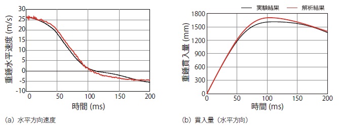 (a)図に示す水平方向速度を見ると,重錘衝突直後からリバウンド状態に至るまで,解析結果は実験結果を概ね適切に再現していることが分かる。