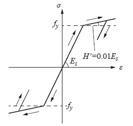 図-3には,本数値解析で用いた鋼部材(鋼製支柱,上弦材,間隔保持材)の応力-ひずみ関係を示している。ここでは,降伏後の塑性硬化を考慮したバイリニア型の等方硬化則モデルを適用することとし,塑性硬化係数H ’は弾性係数の1%と仮定した。また,各構成部材の降伏応力fy,弾性係数Es,ポアソン比νs は,表-1に示す公称値を用いた。なお,いずれの場合も降伏判定はvonMisesの降伏条件に従うものとした。
