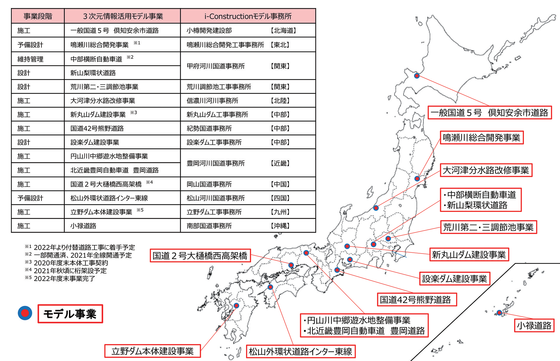 i-Constructionモデル事務所においては先導的に3次元モデルを活用し、各地方整備局等内のリーディング事務所として3次元情報活用モデル事業を推進しており、i-Constructionサポート事務所では地方自治体からの相談対応などを行っている。