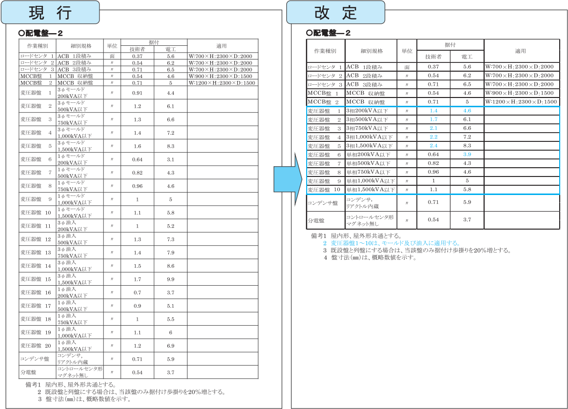 平成27年度から令和元年度までに行った施工合理化調査の結果と現行歩掛を比較すると,モールド変圧器の重量増に伴い,設置に係る作業効率の低下が確認されたことから,1面当たりの設置に係る労務を改定するとともに,モールドと油入の種別統合を行った(図-3)。