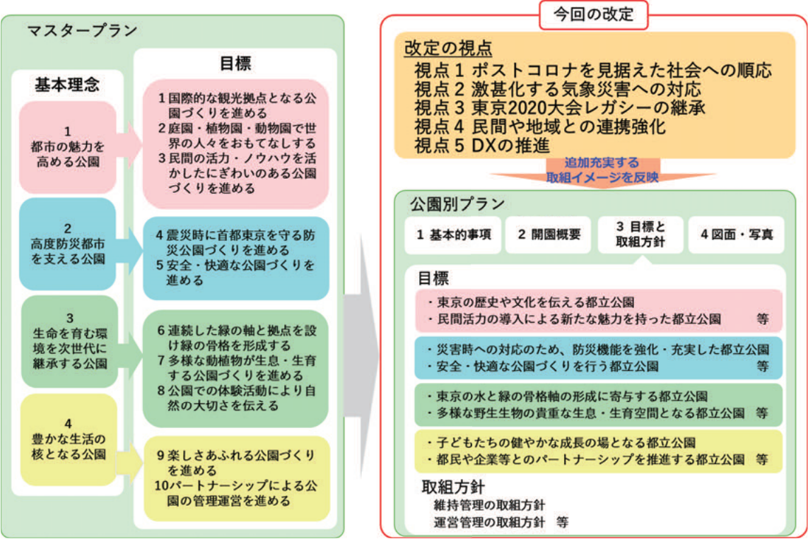 以上の5つの視点や取組イメージを踏まえて,各公園の目標や維持管理・運営管理の取組方針等の追加充実を図り,公園別プランを改定した。