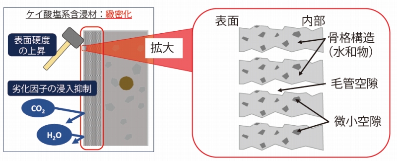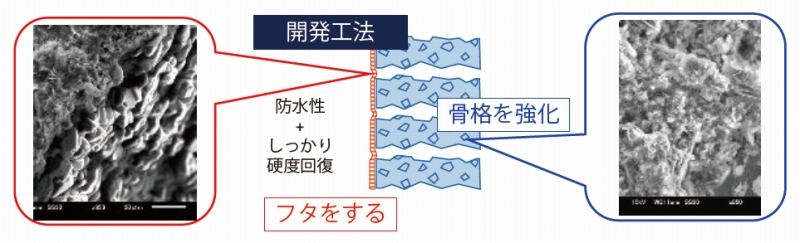 本工法の改質コンセプトは、含浸させたケイ酸により骨格構造が補強されて硬度を回復させること、また、ケイ酸塩により毛管空隙に蓋をすることで防水性を高めることである。