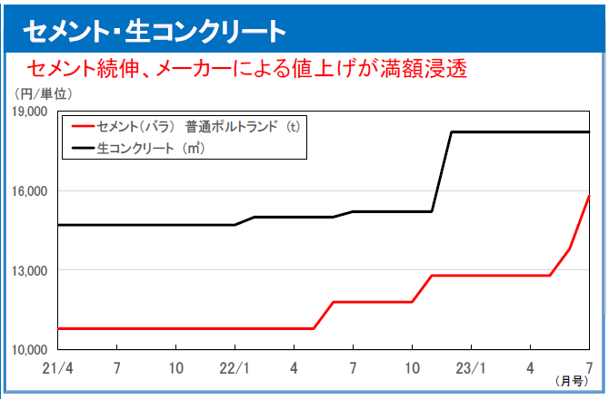 最新の6月調査でも、セメントや生コンの上昇は全国的に続いており、東京地区ではセメントが2カ月連続の続伸。