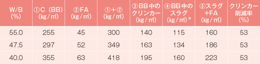 高炉セメントB種にフライアッシュⅡ種をセメント質量の内割で15% 混合したコンクリート配合を計画し、普通ポルトランドセメントを用いた同一呼び強度コンクリートに比べ、クリンカー由来のCO2を約50%※3削減できる低炭素型コンクリートを標準化しました(表- 1)。
