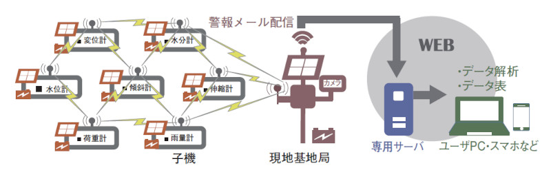本システムは設置・撤去・メンテナンスが容易な無線センサであり、斜面の変位や地下水位等の常時監視が可能となっている。