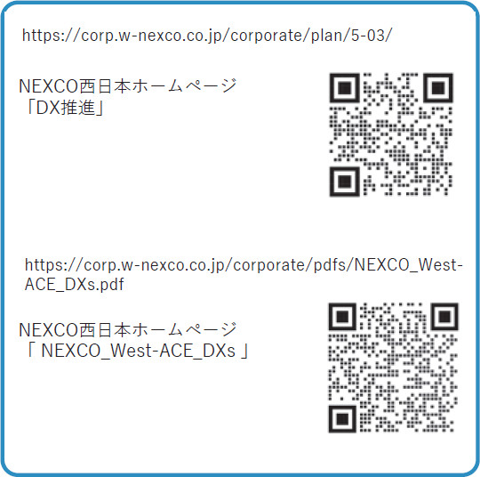 この一環として、NEXCO西日本ではデジタル技術を活用することで、業務の効率化・生産性の向上を推進し高速道路事業を進化させることを目的として、“NEW ACE DXs”を定めている。