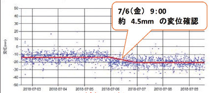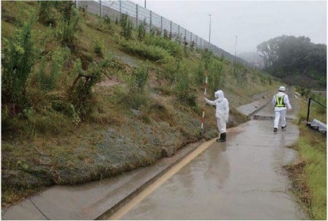 西日本豪雨(平成30年7月)において、新名神高速道路 茨木千提寺ICの盛土においてRTK- GNSS(地表面変位計測)によって図- 4に示すとおり、約4.5㎜の変位を検知したことから緊急点検を実施し、写真- 2のような表層崩壊を確認したため応急復旧を実施した。