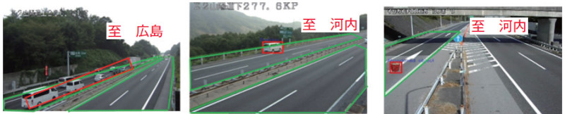 また、「停止車両」と「落下物」については、異常事象の対象物体が赤枠で強調表示され、それぞれ路肩停車中のワゴン車を検知したもの、本線上に落下しているポリバケツを検知したものである。