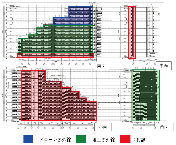 2年目は、1年目に得られた赤外線法が打診と同等の精度であるとの検証結果を基に、外壁調査ベストミックス法の検証のため、打診法で全面を調査し、地上赤外線法およびドローン赤外線法をできる限り適用して実施した。
