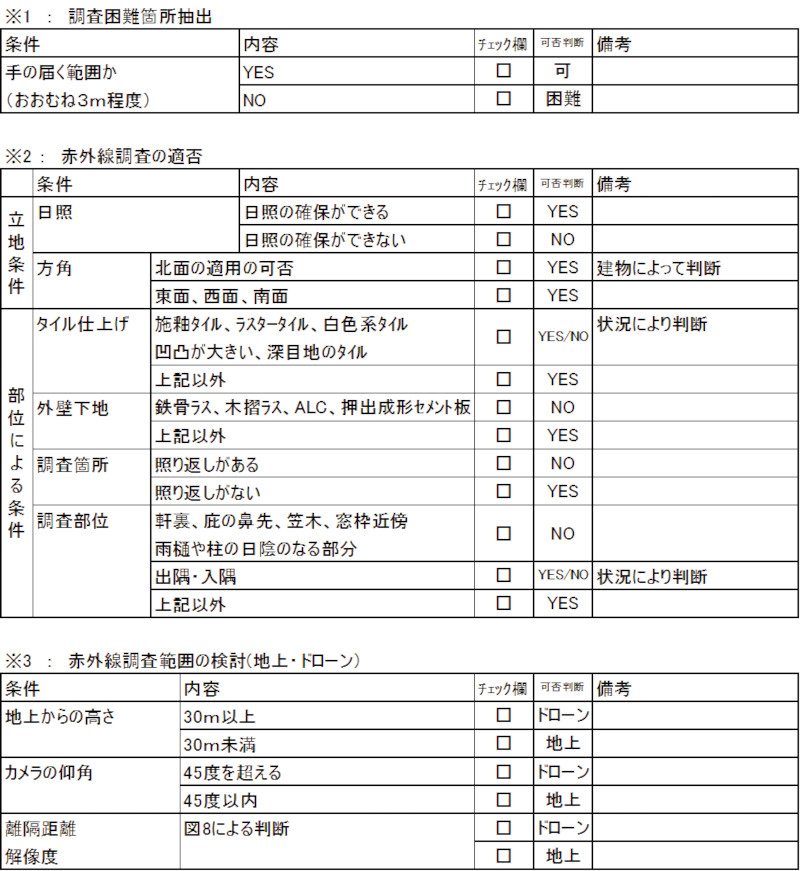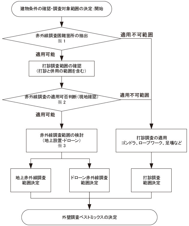 表- 1に示す赤外線法の適用部位の判断(図- 4 中の※1 ※2 ※3)を優先して決定し、赤外線法が適用できない部位を打診することとした。
