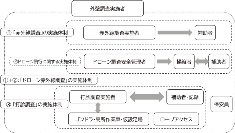 打診法は打診者と判断した結果を転記する記録員、狭隘部はロープブランコ、赤外線調査では赤外線技術者、ドローン赤外線法ではドローン飛行のための操縦者、飛行の安全を確保するための建築物飛行安全管理者の構成である。