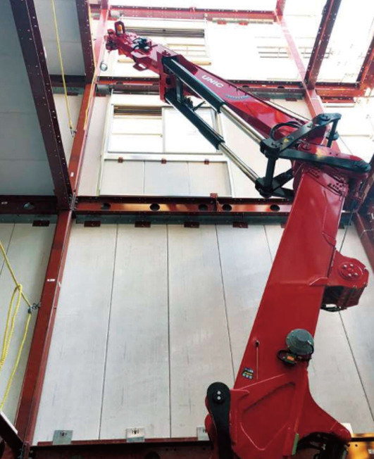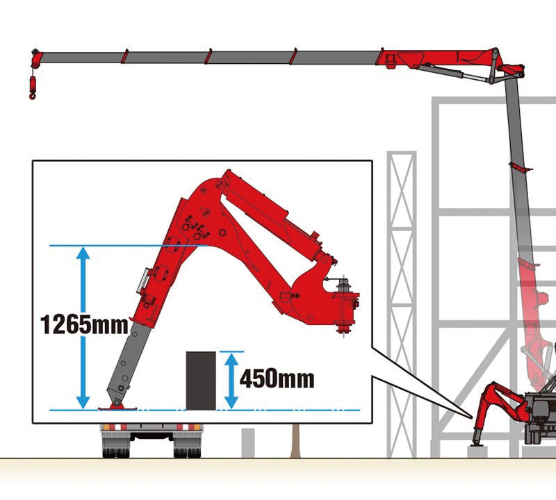 古河ユニック(株)の「U-CUBE」は、伸縮型起伏ブームを採用したことで、従来の技術では届かなかった建物奥や障害物の裏側へのアクセスが容易となり、架空線や足場などを避けながらの資材搬入を実現する。