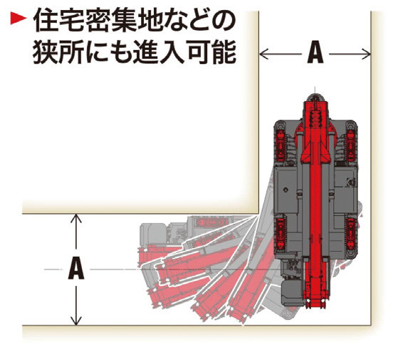 移動式クレーンとしては機動力が高いが、機体の大きさ等から、狭小現場への進入や設置が困難な場合がある。
