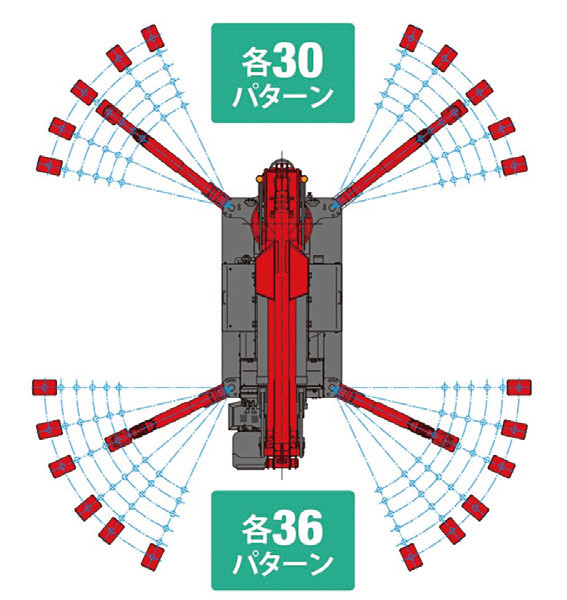 また、優れた小回り性能と豊富なアウトリガ設置パターン(前方各30パターン・後方各36パターン)により、多様な作業姿勢を選択することができる。