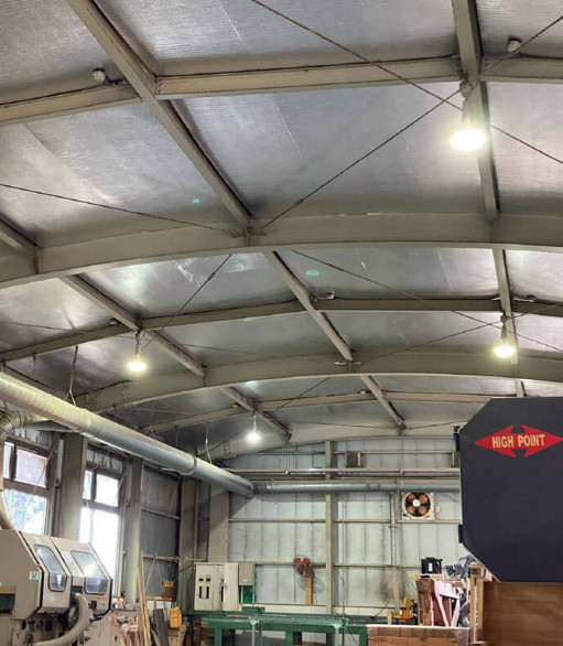 文化シヤッター(株)の「はるクール」は、屋根の内側に設置する遮熱シートであり、太陽光で熱せられた屋根から発生する輻射熱(遠赤外線)を反射し、最大で97%をカットすることで、建物内の温度上昇を抑制する。
