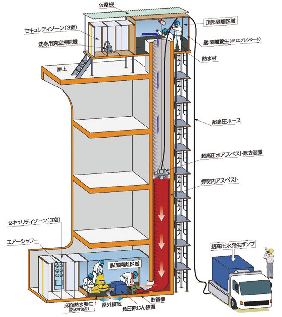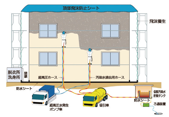 超高圧水を使用した工法である為、石綿除去に必要な常時湿潤状態が維持でき、環境面・作業員の安全面にも効果的な工法である。