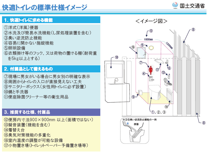 こうした中で、2016年に国土交通省は建設現場の職場環境改善の流れを受けて「快適トイレ」の標準仕様を発表しました。