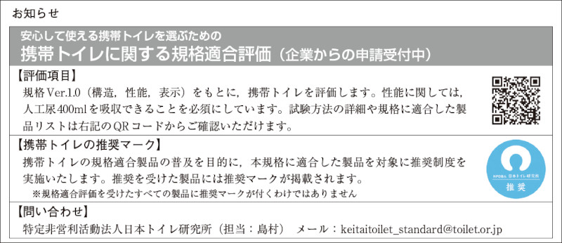 さらに、日本トイレ研究所は、2025 年に災害時に使用する携帯トイレの品質を明確化するために独自の規格を作成し、規格適合評価制度をスタートしました。