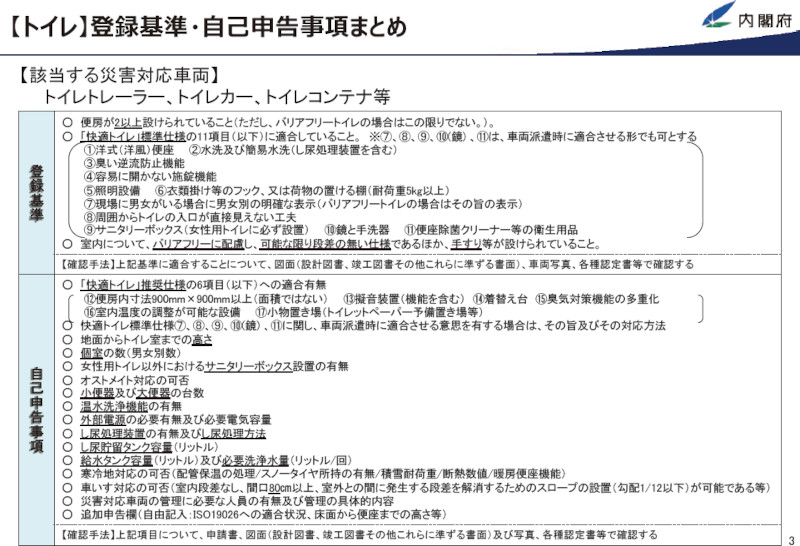 また、2025年、トイレカーやトイレトレーラーなど、機動性の高い移動式トイレに関しては、内閣府が「災害対応車両」として登録するための基準を作成しました。