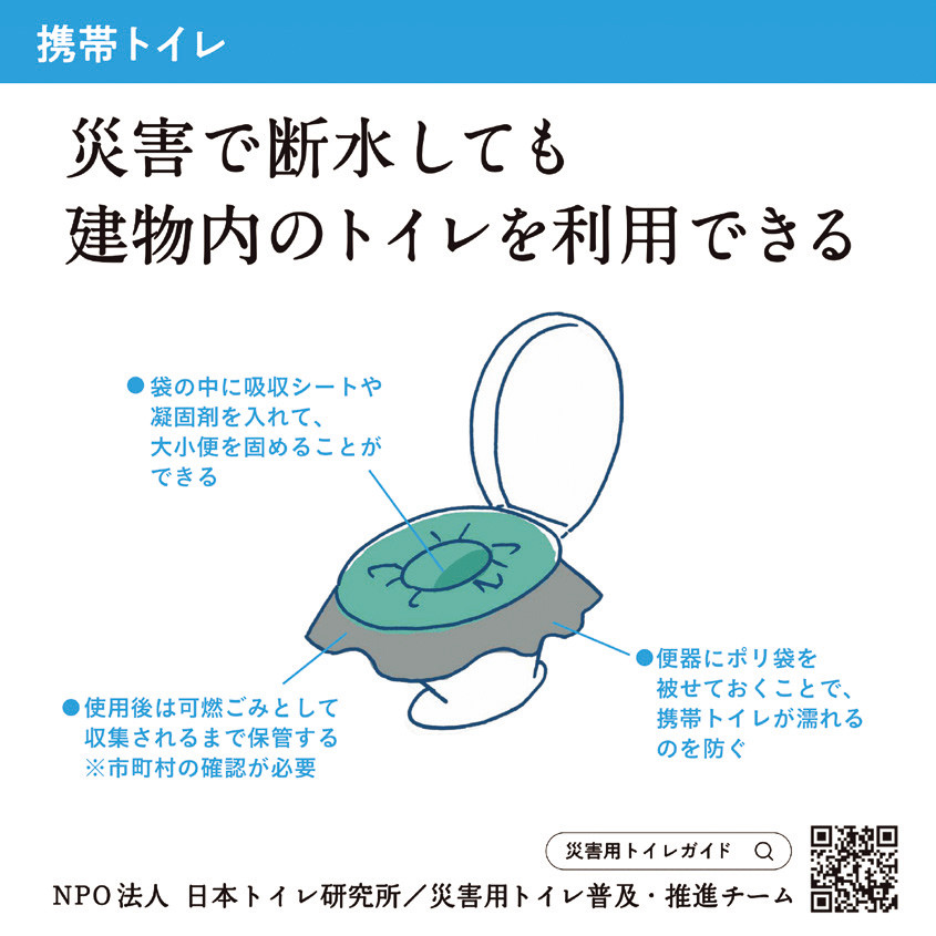災害発生後、まだ仮設トイレが届かない段階で重要になるのが携帯トイレです。