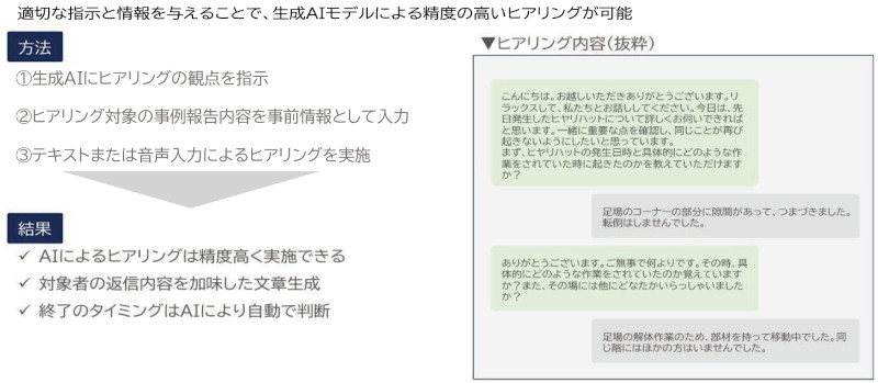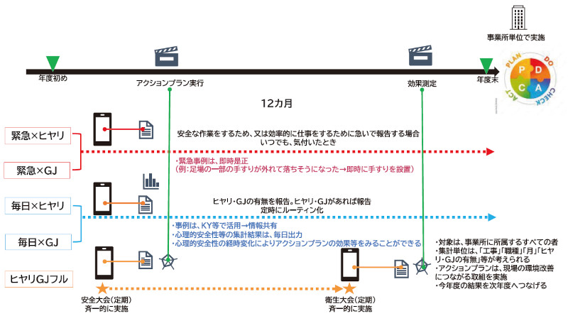 具体的には、「ヒヤリハット」からは事故に至らず災害を回避できた体験者の知恵や対処方法を、「グッジョブ」からは安全かつ効率的に仕事を行うためのアイデアや暗黙知を自発的な現場従事者からの報告により得るものです。