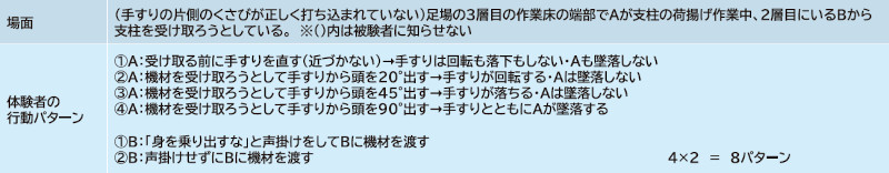 ここで紹介するのは、手すり先行システム足場において、くさびがしっかり打ち込まれていない状態だったため(図- 8)、体を預けたところ手すりが回転し、墜落しそうになったというヒヤリハット事例(図- 9)ですが、ポイントはメタバース上で再現する際は、被験者たちにその状態であることは知らせないで、作業を体験させるという点です。