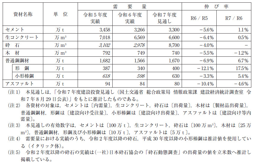 本稿では、令和7年10月31日に公表した「令和7年度 主要建設資材需要見通し」の概要を報告する。