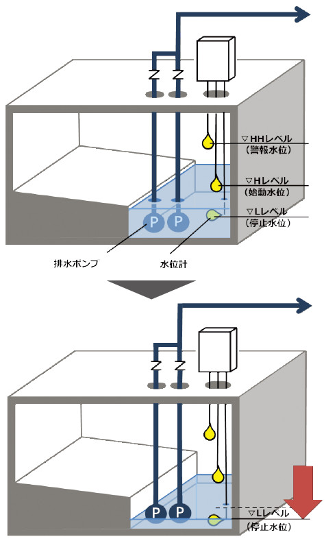 貯留した排水は、ポンプでくみ上げて下水道管に排除している。